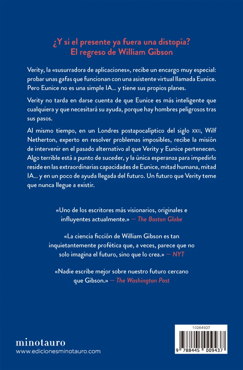 William Gibson es uno de los escritores de ciencia ficción más influyentes y elogiados del mundo. Es autor de doce novelas (incluyendo La máquina diferencial coescrita con Bruce Sterling), una antología de relatos (Quemando cromo) y una colección de ensayos (Distrust That Particular Flavor). Considerado un visionario, difunde un potente discurso acerca de nuestros deseos culturales, miedos y obsesiones sobre temas como las multinacionales, la política global, los datos computarizados, la ingeniería genética, la cibernética, el miedo a lo tecnológico y, en última instancia, el significado de ser humano en una era infinitamente compleja.