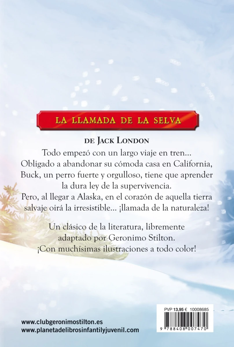 Todo empezó con un largo viaje en tren… Obligado a abandonar su cómoda casa en California, Buck, un perro fuerte y orgulloso, tiene que aprender la dura ley de la supervivencia. Pero, al llegar a Alaska, en el corazón de aquella tierra salvaje oirá la irresistible… ¡llamada de la naturaleza! El clásico de Jack London libremente adaptado por Geronimo Stilton.